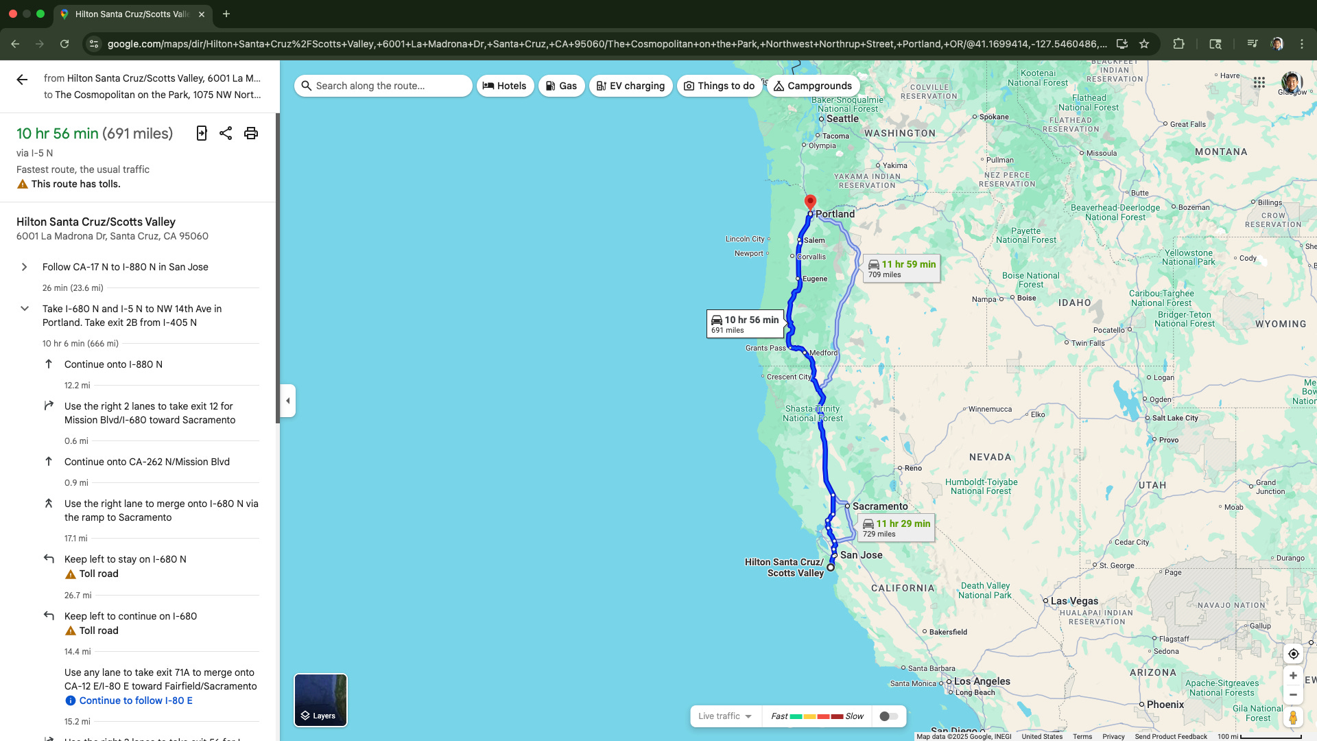 It’s about an 11-hour journey. We broke it into two days going south: four hours to Ashland, Oregon on day one, then seven hours the next day with a stop at the Shasta Cascade Welcome Center in Anderson, California. Coming home, we pushed through in one day with stops in Vacaville and Medford.