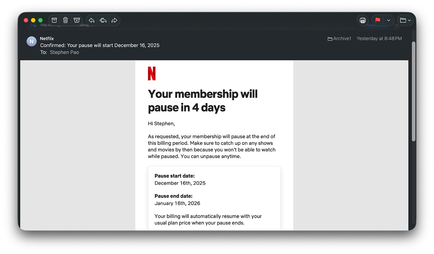 Then, given the Netflix–WBD news, I just put Netflix on the first month of “pause.” And while I was at it, I paused Hulu / Disney+ / ESPN, too.