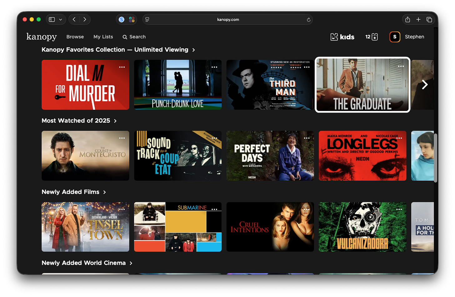 Kanopy leaned toward the more “oldie” titles. Top‑streamed films included Dial M for Murder and The Graduate.