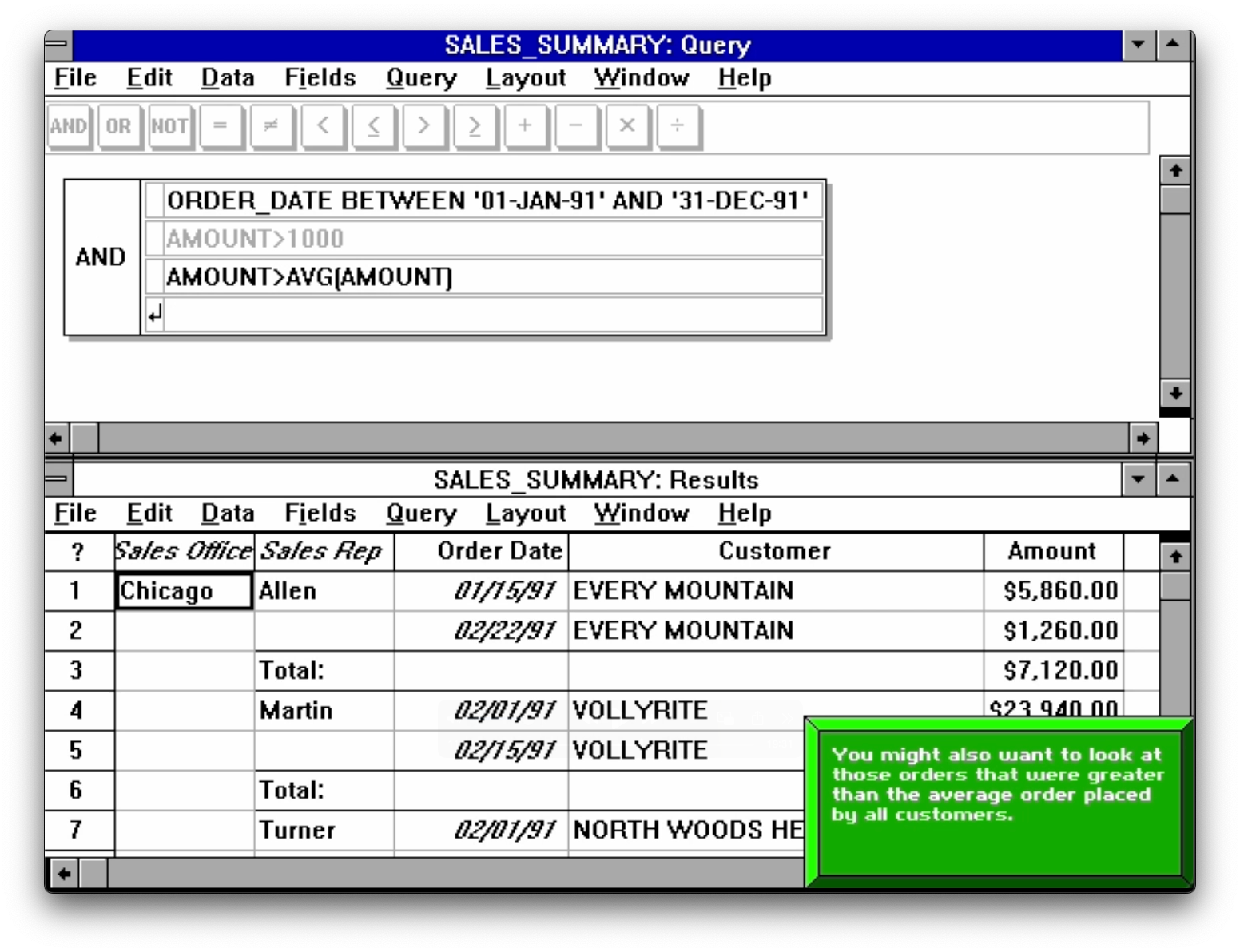 For example, the query below allows an analyst to look at all orders in 1991 greater than $1,000.