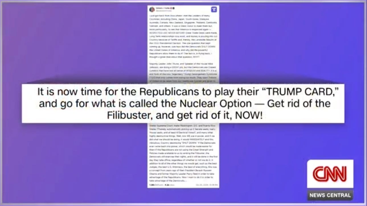 Trump returned from Asia talking about removing the filibuster to pass the appropriations bill and reopen the government. The conflicting desire of Senate Republicans to keep the filibuster was the topic of the Sunday news programs yesterday morning.