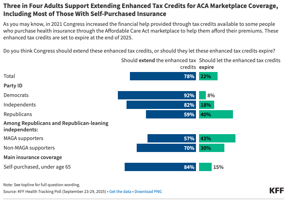 Note this isn’t new spending, as these ACA subsidies were already in place as the result of the American Rescue Plan Act in 2021 and were extended by the Inflation Reduction Act of 2022. The discussion was not new spending but whether to extend subsidies. I’ve mentioned before that extending these subsidies is what the American people want, making up 3 in 4 adults who support extending these subsidies, including 59% of Republicans and 57% of MAGA supporters.