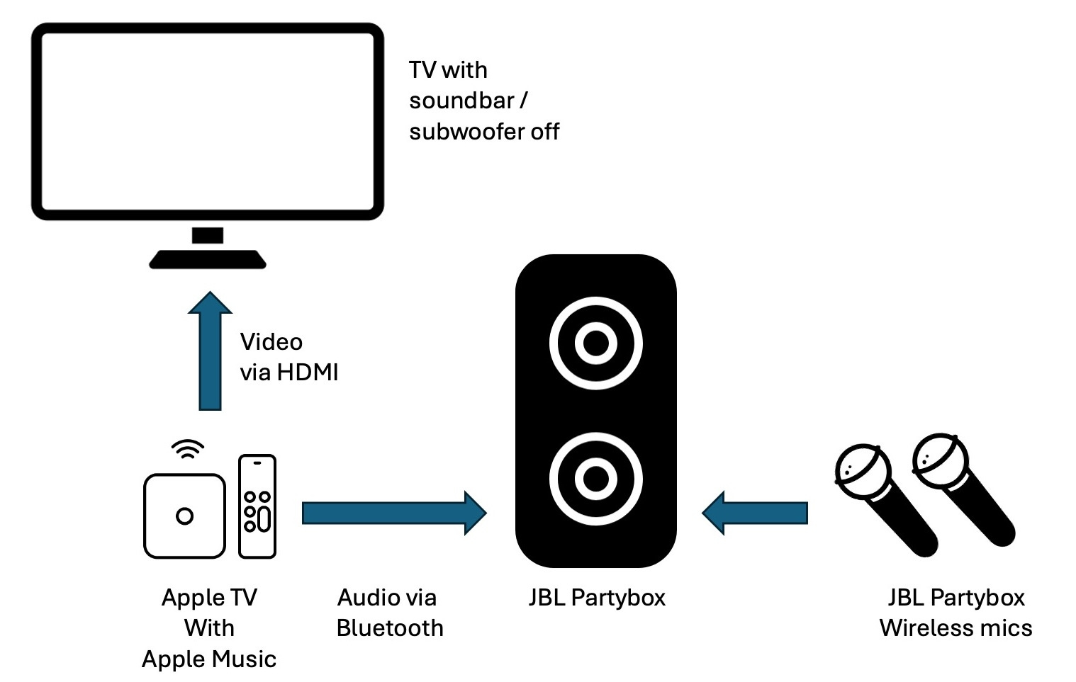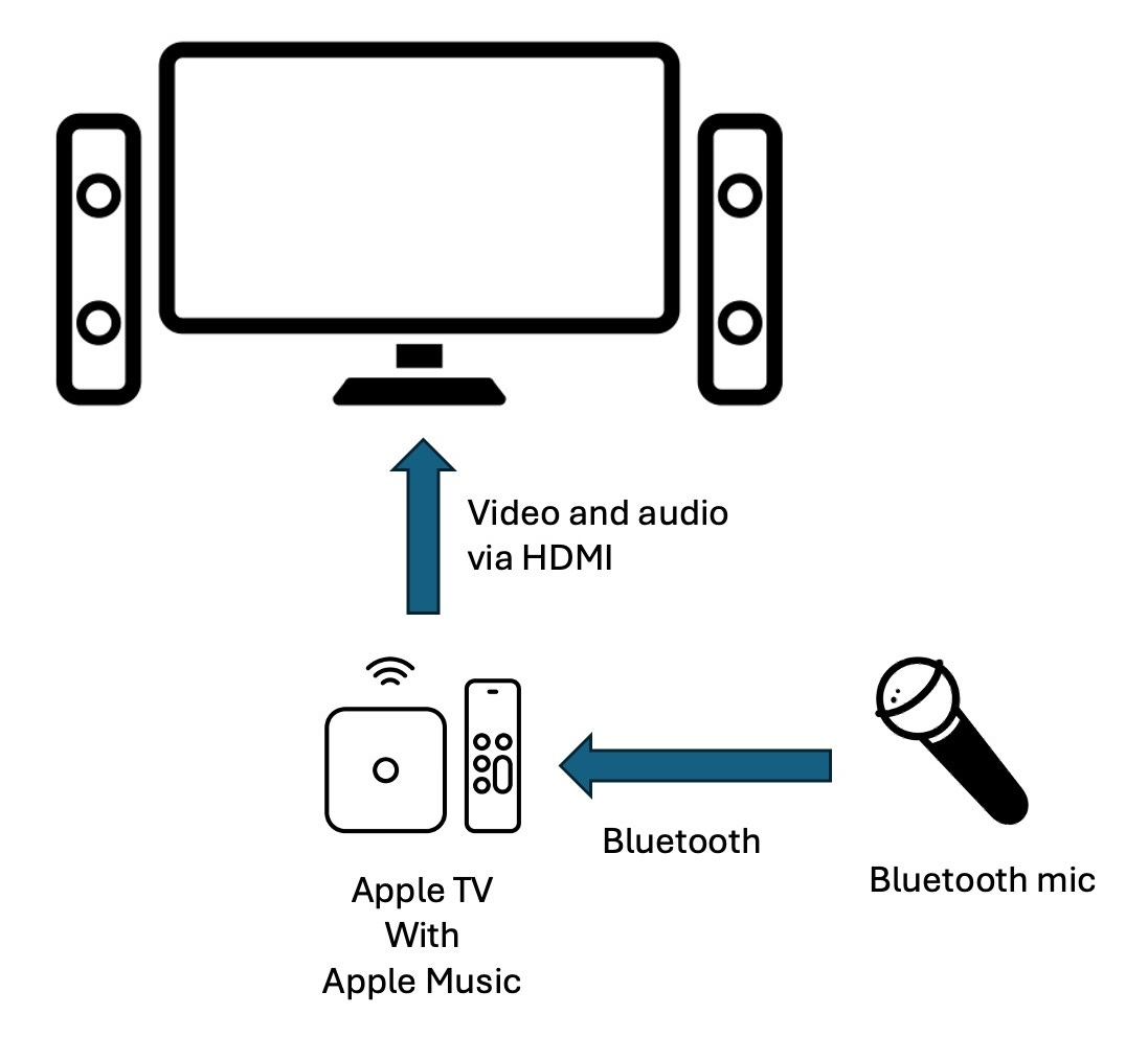 The setup is straightforward, as it uses the existing setup for Apple TV with the existing A/V setup already set up to watch movies. The primary difference can be as simple as adding a Bluetooth mic, and the Apple TV can handle the sound mixing without any extra equipment!