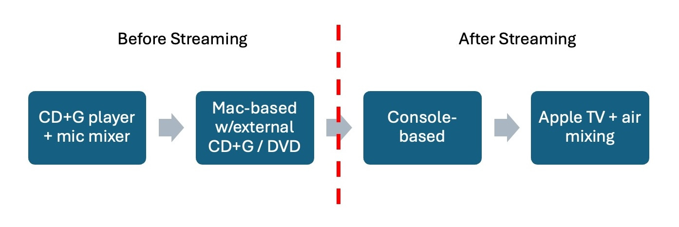 Just as Spotify, Apple Music, and Netflix eliminated the purchase of CDs and DVDs for commercial music and movies, streaming also upended the CD+G and Karaoke DVD market. Most of this streaming revolution with karaoke happened after we left the suburbs, so most of these experiences are ones I’ve had using friends’ equipment and not my own!