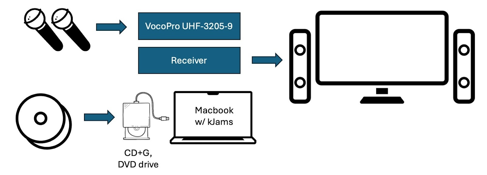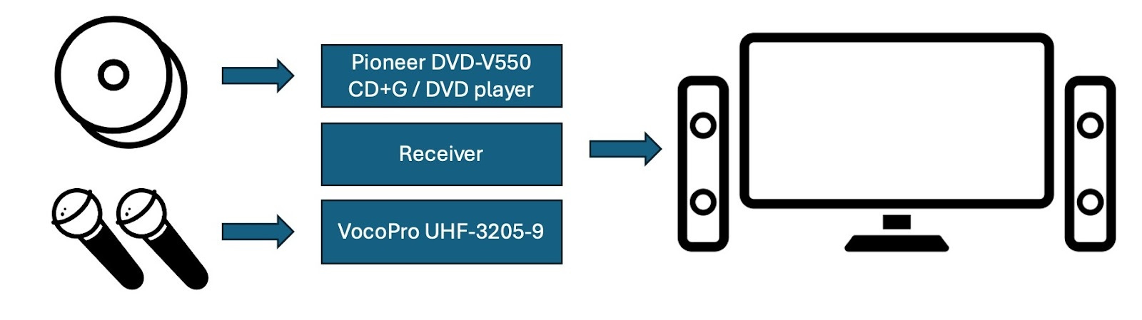 I kept the wireless mics I had from the previous setup, and I could connect the mics into the mic jack for the Mac which handled the audio mixing. The mixed audio out from the Macbook went into the stereo receiver directly. I used a video adapter to connect the video out of the Macbook to the TV.