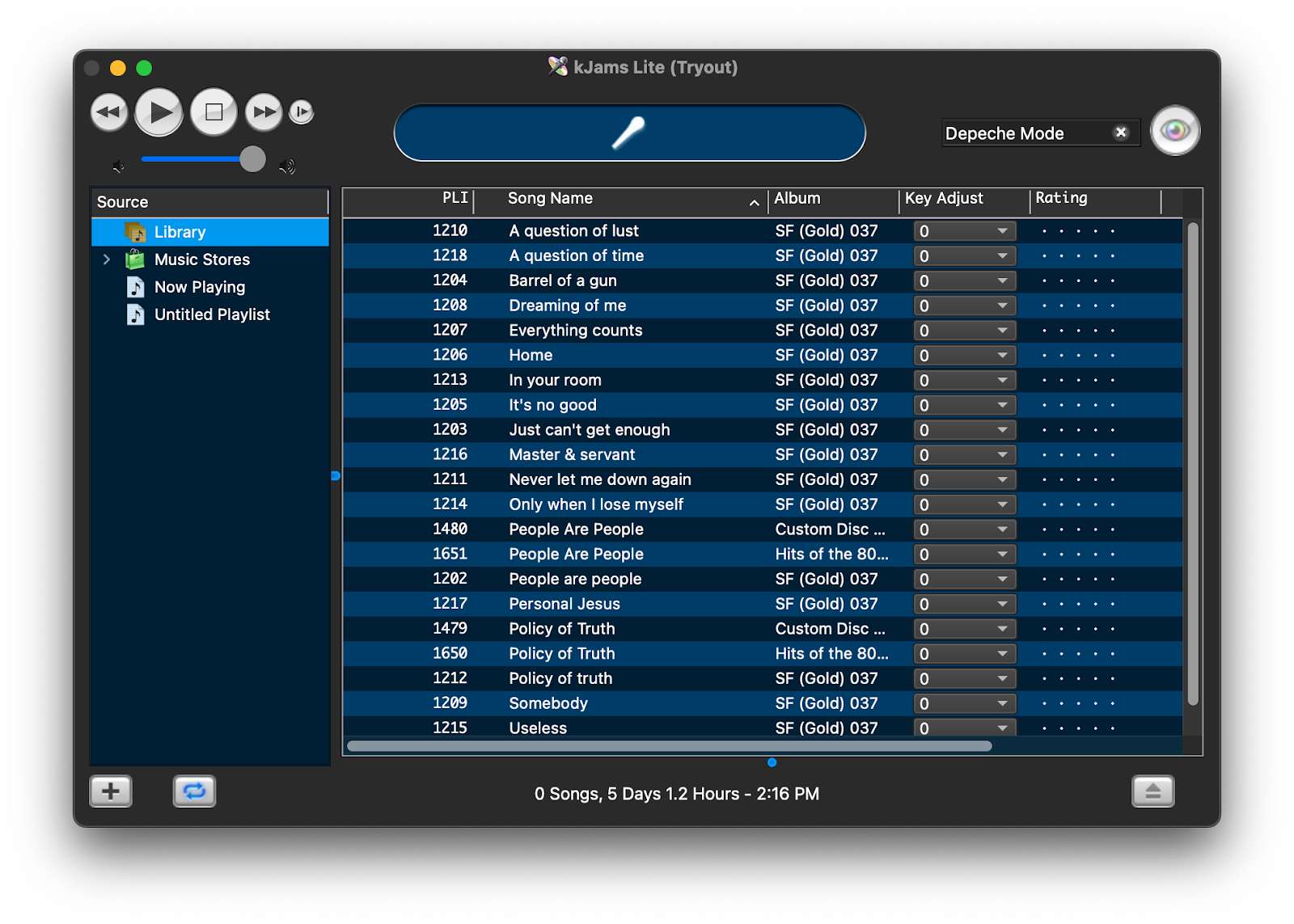 To write this article, I recovered my kJams library from backup, reloaded the software, and took a couple of screenshots of some searches. Here’s a search for “Depeche Mode” (my favorite band!).