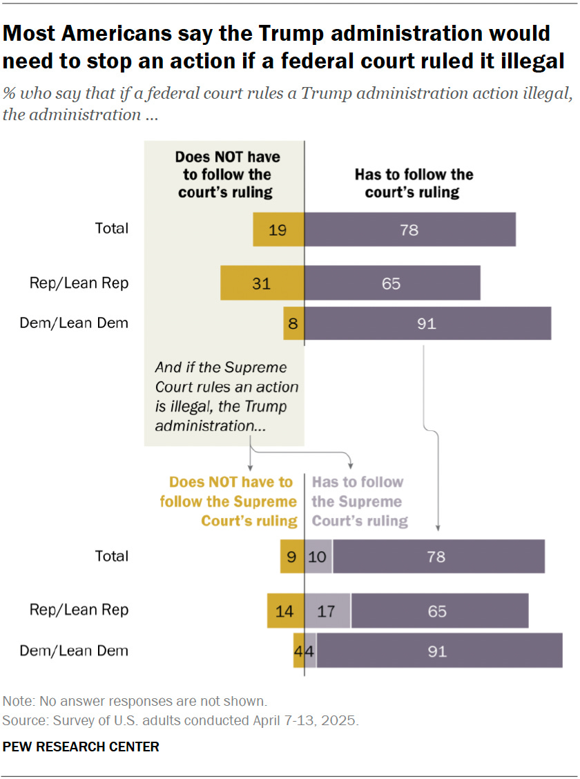 This adherence to court rulings and the rule of law remain an issue that the vast majority of Americans, both Democrat and Republican, believe in, too. According to Pew Research, most Americans say the Trump administration would need to stop an action if a federal court ruled it illegal.